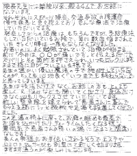 バイクで交通事故にあってしまい、病院で頚椎捻挫、腰椎捻挫と診断されました。 しばらく歩くことも振り返ることも出来ず「このまま治らなかったらどうしよう」という不安な日々を過ごしていました。 そんな時、先生に色々優しい言葉をかけて頂き勇気をもらいました。 体も日に日に良くなり今では大好きなサッカーも楽しんでいます。 本当にありがとうございました。